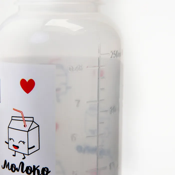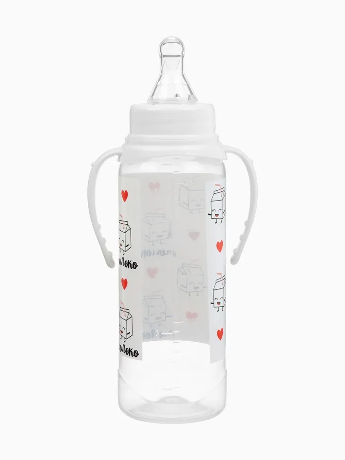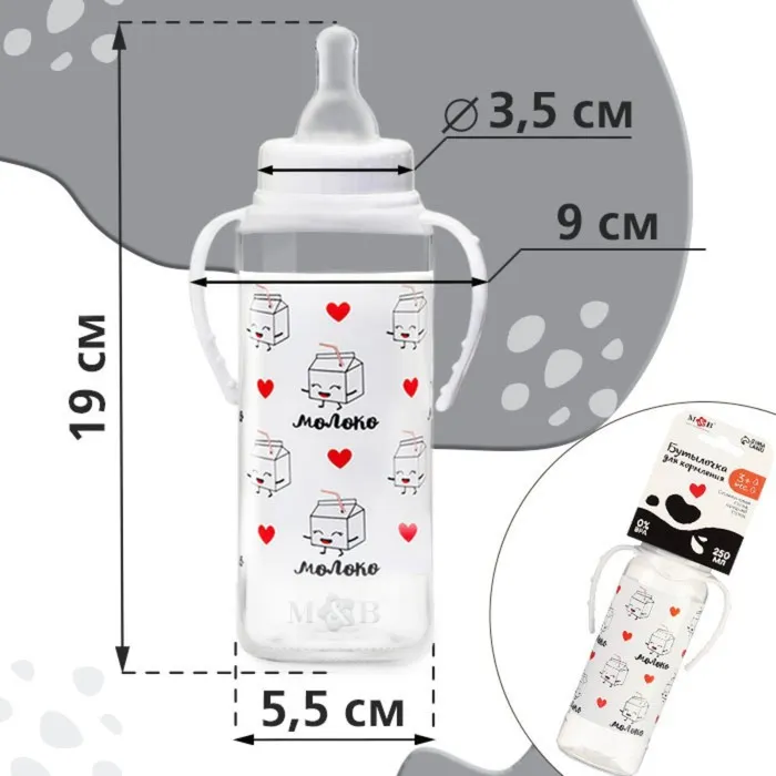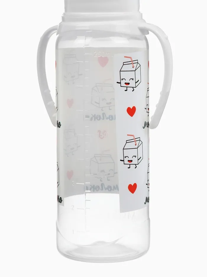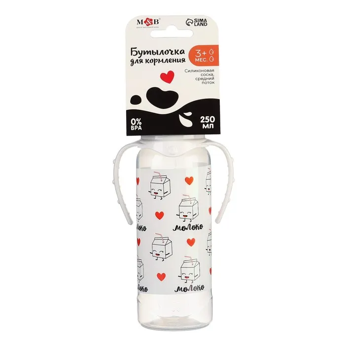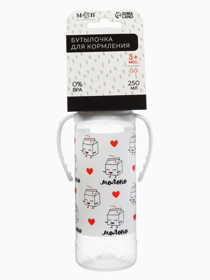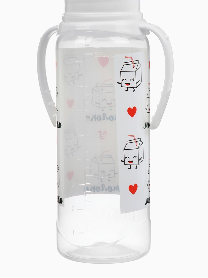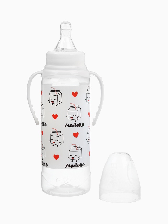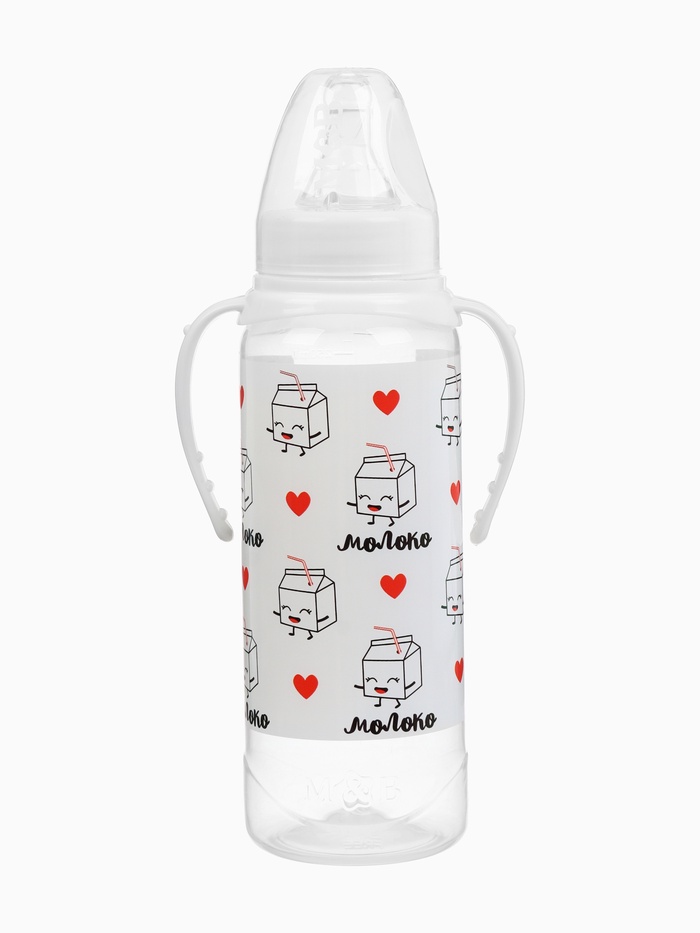 Бутылочка для кормления M&B «Люблю молоко», классическое горло, с ручками, от 3 мес., 250 мл., белый — Характеристики