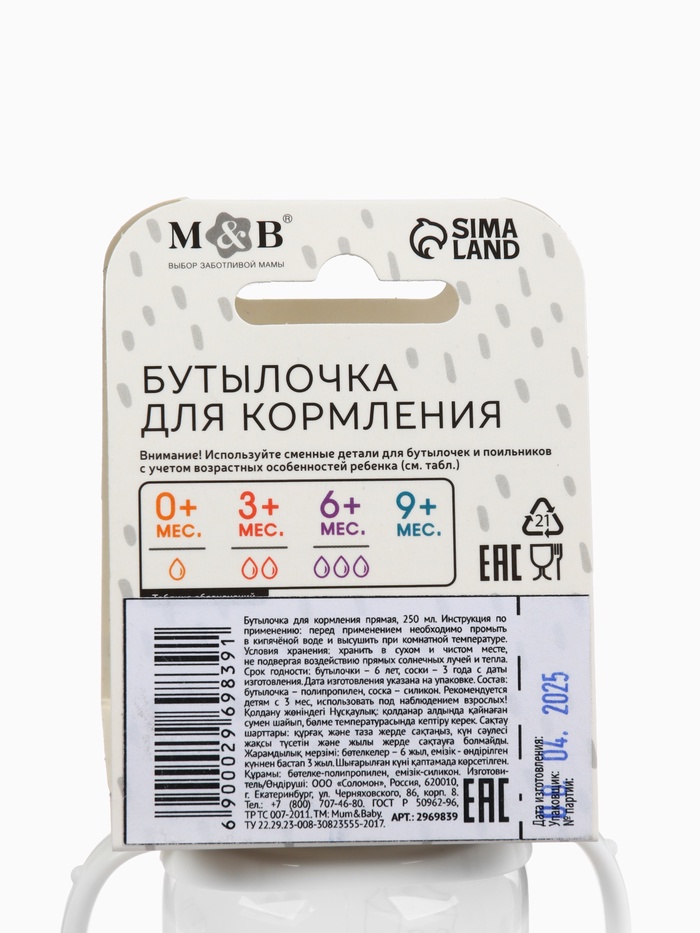 Детская бутылочка изготовлена в России из сырья отечественного производства. Все материалы сертифицированы и безопасны для здоровья новорождённых. Полипропилен и силикон не выделяют вредных веществ при контакте с жидкостью и стерилизации.