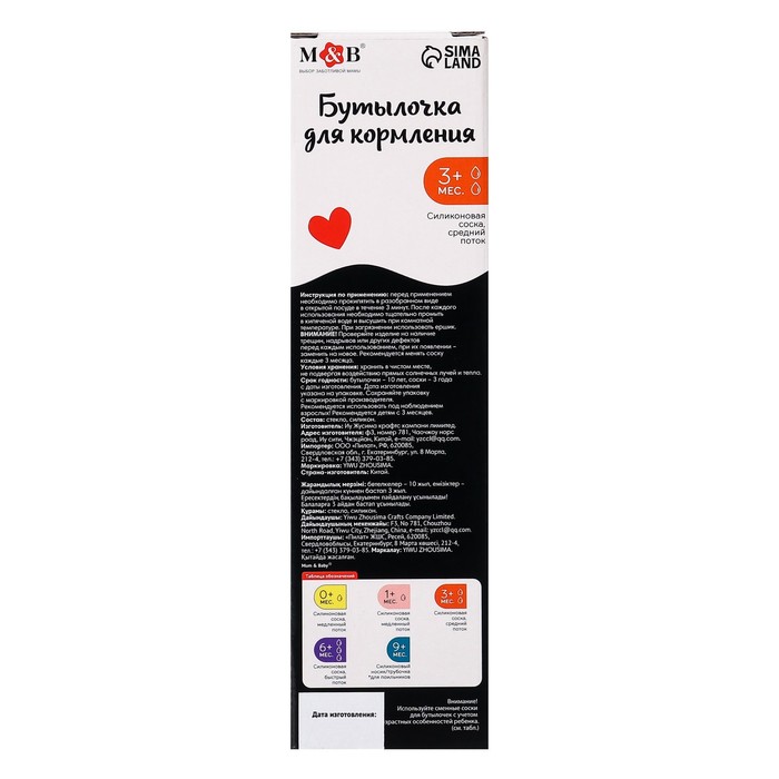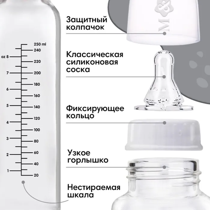 Бутылочка для кормления M&B Milk, классическое горло, от 3 мес., 250 мл., стеклянная — Характеристики