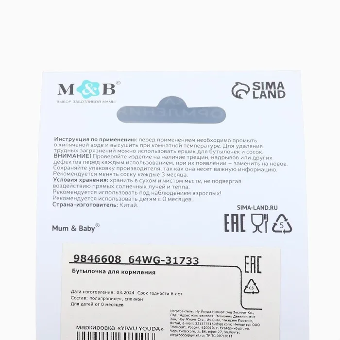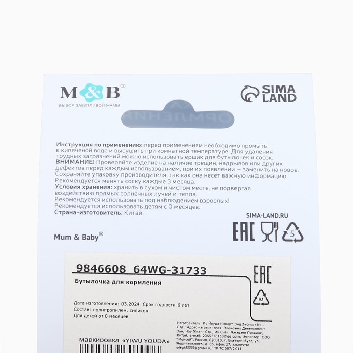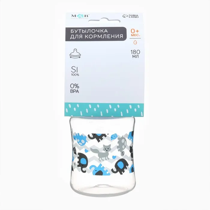 Бутылочка для кормления M&B, широкое горло, Ø50 мм, от 0 мес.,180 мл., голубой — Характеристики