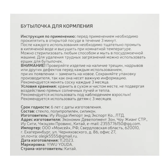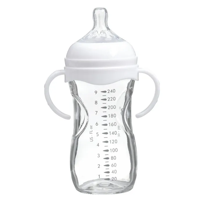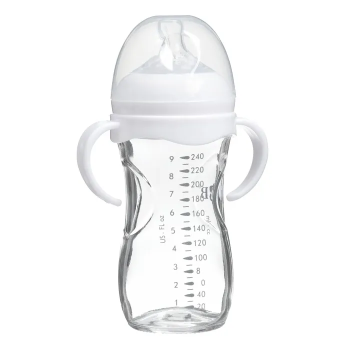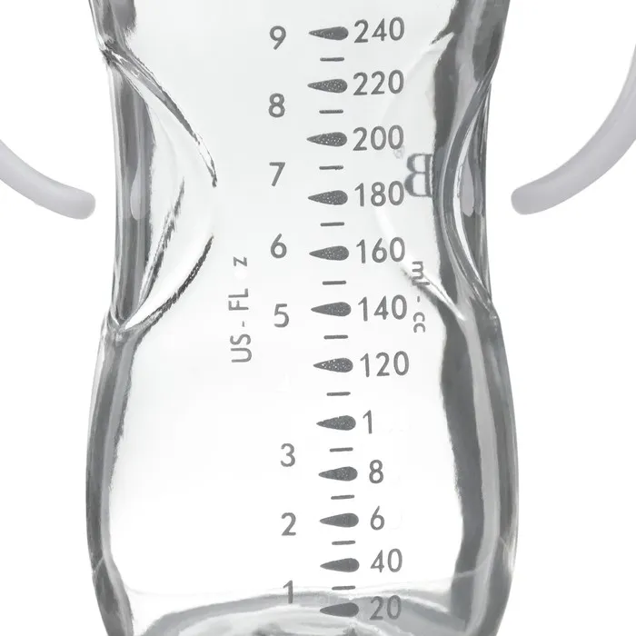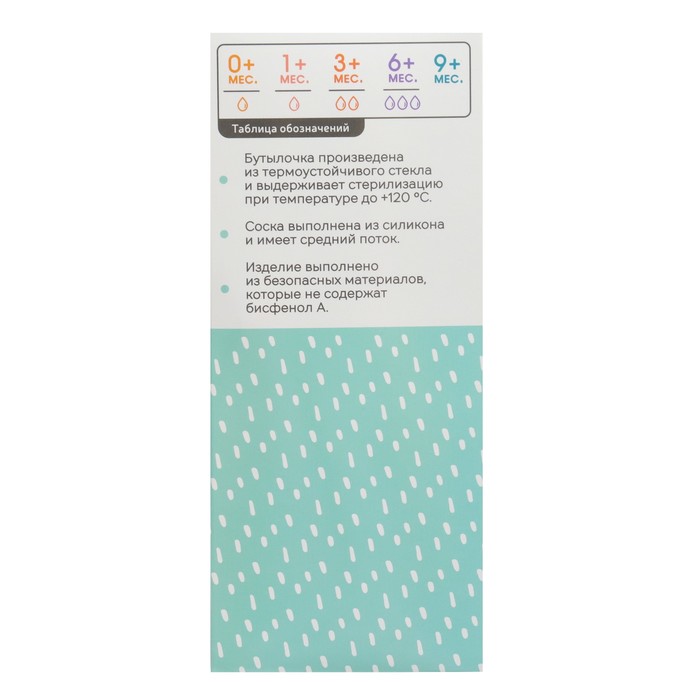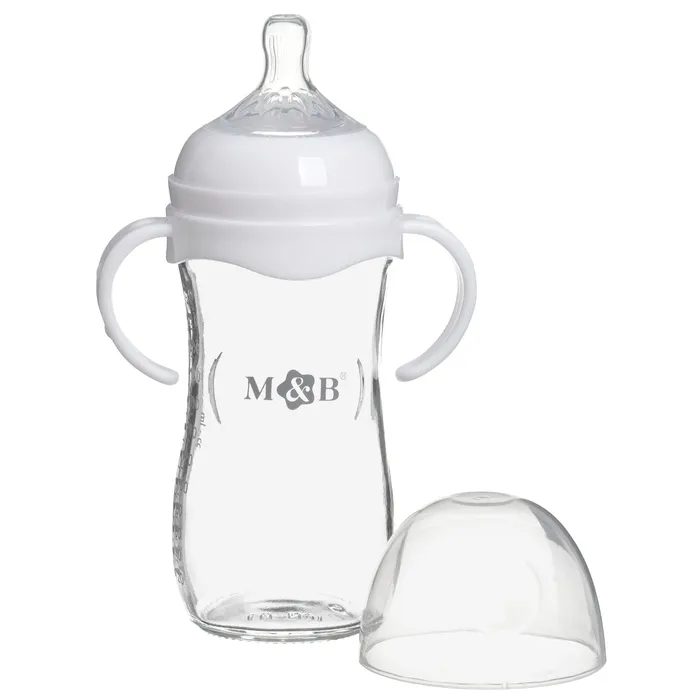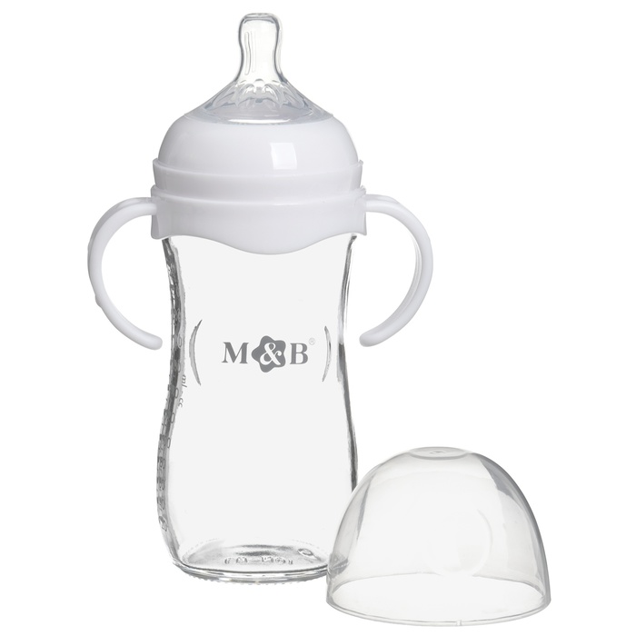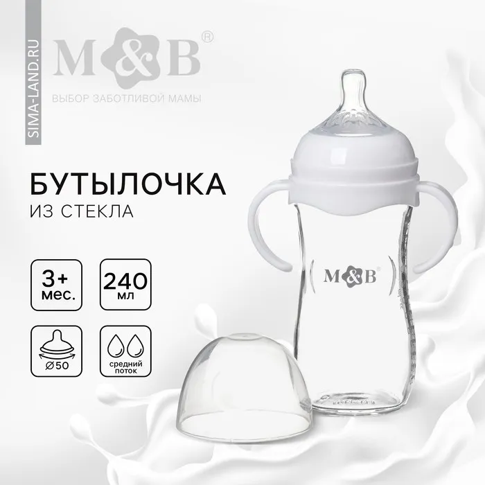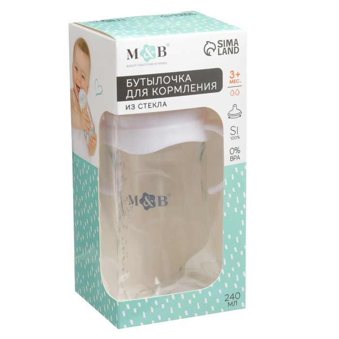 Бутылочка для кормления M&B, широкое горло Ø50 мм, от 3 мес, 240 мл., стекло, белый — Характеристики