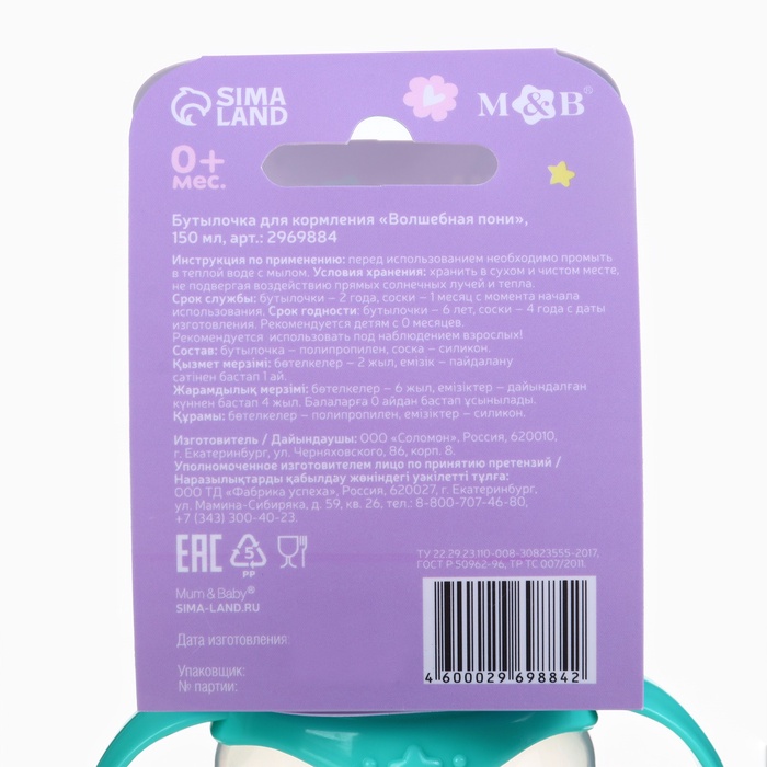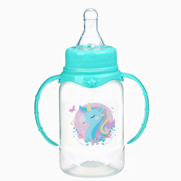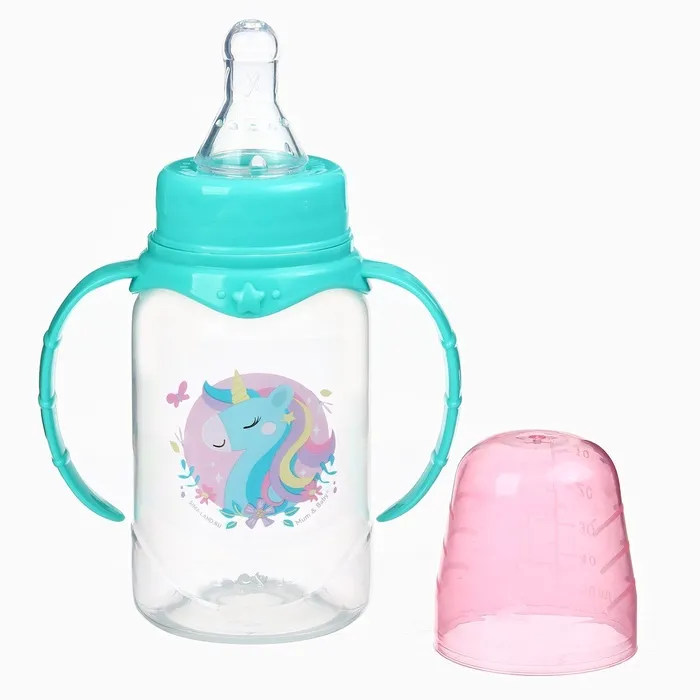 Бутылочка для кормления M&B «Волшебный единорог» от 0 мес., 150 мл, с ручками, цилиндр, бирюзовый — Характеристики