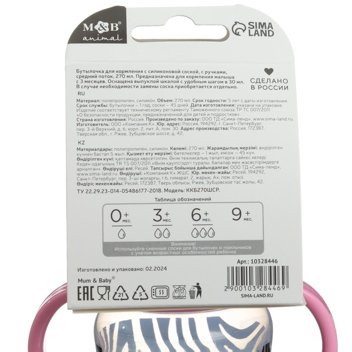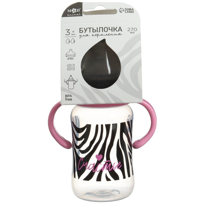 Бутылочка для кормления M&B «Зебра», широкое горло, средний поток, от 3 мес., 270 мл. — Характеристики