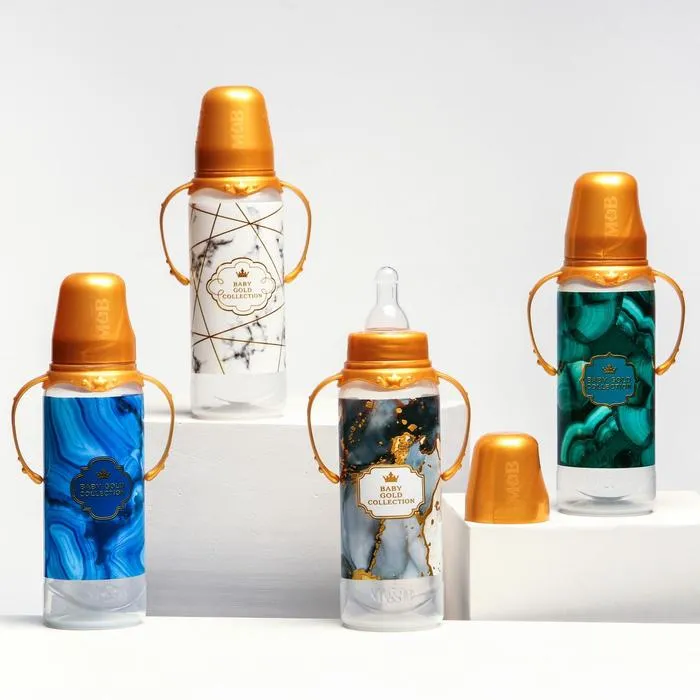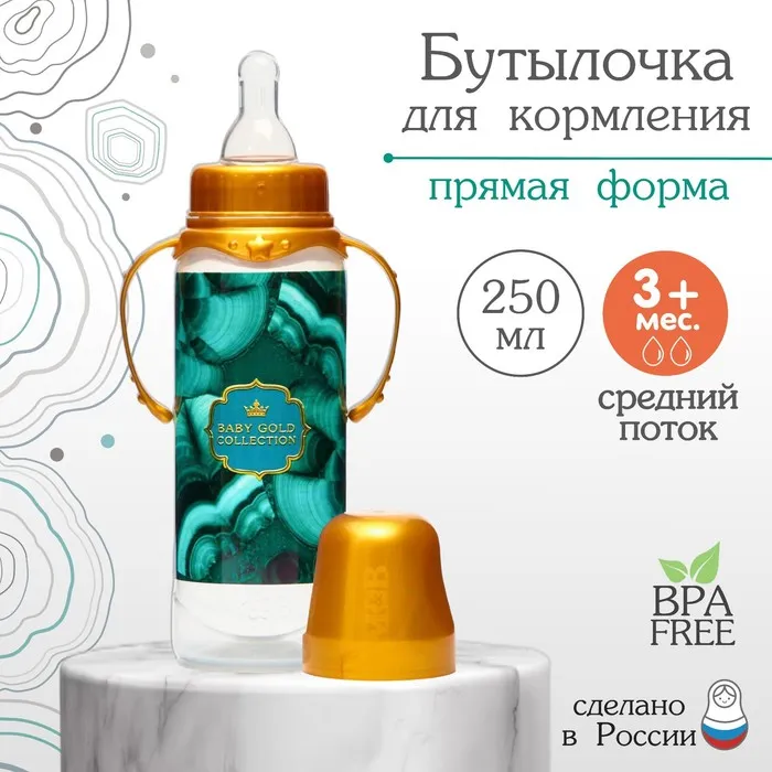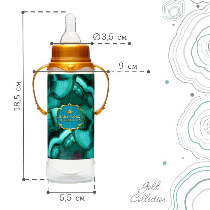 Бутылочка для кормления M&B «Золотая коллекция: малахит», классическое горло, 250 мл., от 3 мес., цилиндр, с ручками — Характеристики