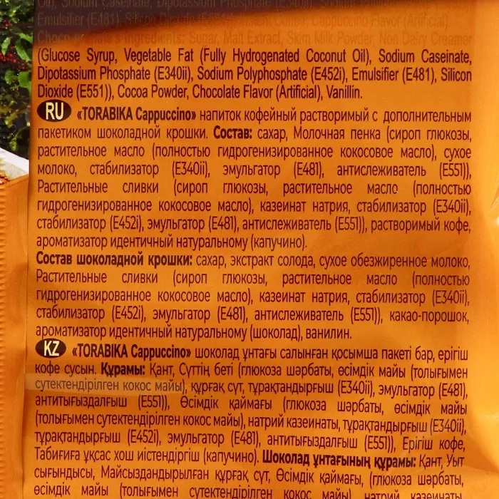 Состав: сахар, сливки для образования пенки (сухой глюкозный сироп, растительный жир, сухое молоко, стабилизатор Е340ii, эмульгатор Е481, ароматизатор), заменитель сливок (сироп глюкозы, гидрогенизированные растительные жиры (кокосовое и/или косточковое пальмовое масло), казеинат натрия, стабилизатор Е340ii, эмульгатор (Е471, Е481), стабилизатор Е452i, антислёживатель Е551), растворимый кофе, ароматизатор идентичный натуральному (вкус капучино).