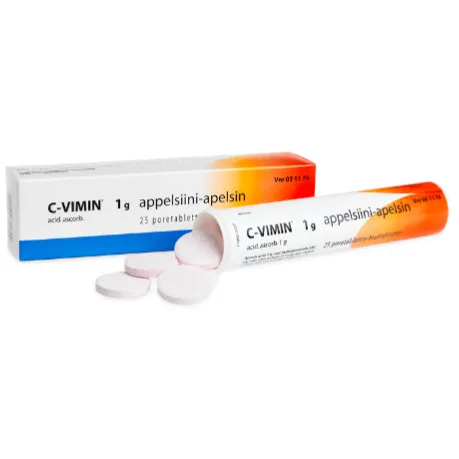 C - vimin - содержит витамин С ( аскорбиновая кислота ) со вкусом апельсина. Витамин С необходим для организма, является мощным антиоксидантом, предохраняет организм от бактерий и вирусов, оказывает противовоспалительное и противоаллергическое действие, укрепляет иммунную систему и усиливает действие других антиоксидантов. Также витамин С оказывает влияние на синтез ряда гормонов, в том числе антистрессовых, регулирует процессы кроветворения и нормализует проницаемость капилляров, участвует в синтезе белка коллагена, что необходимо для роста клеток и хрящевых тканей, улучшает способность усваивать кальций, выводит токсины, регулирует обмен веществ.