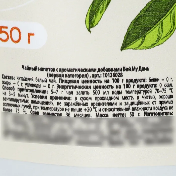 Чай Бай Му Дань, спокойствие и ускорение обмена веществ , 50 г. — Характеристики
