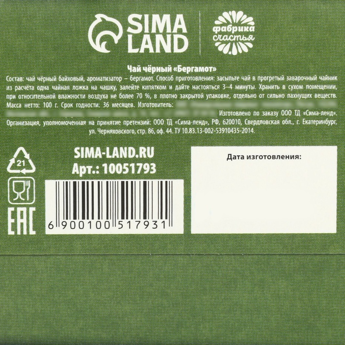 Чай чёрный «23 февраля», вкус: бергамот, 100 г. — Характеристики