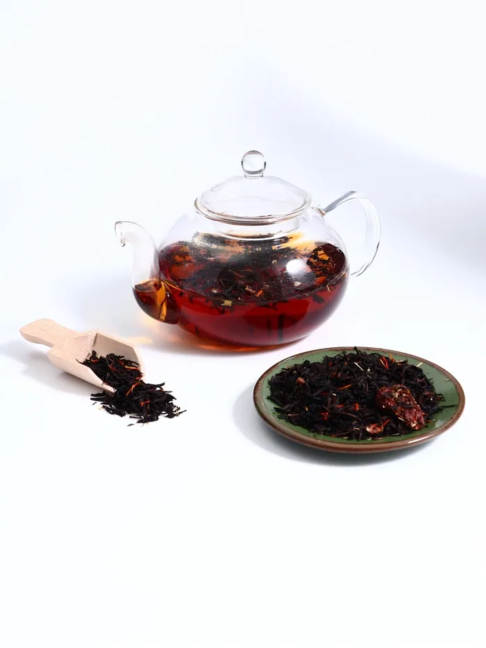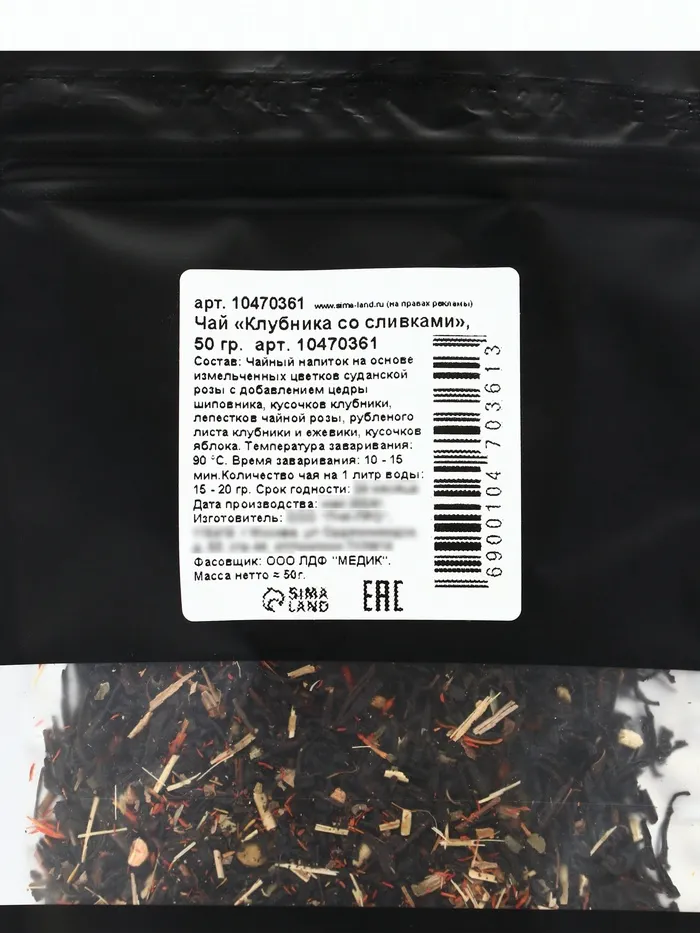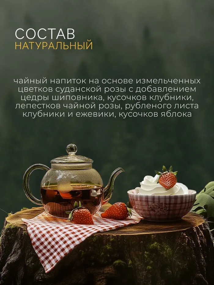Состав: чёрный чай, измельчённые цветки суданской розы, цедра шиповника, кусочки клубники, лепестки чайной розы, рубленый лист клубники и ежевики, кусочки яблока.