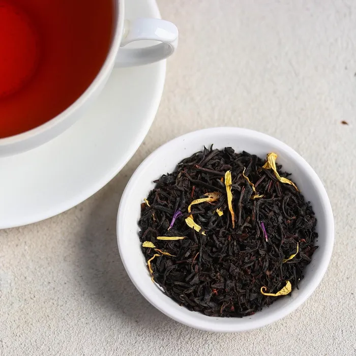 Состав: чай черный байховый, цедра лимона, лепестки календулы и василька, ароматизатор «Бергамот».
