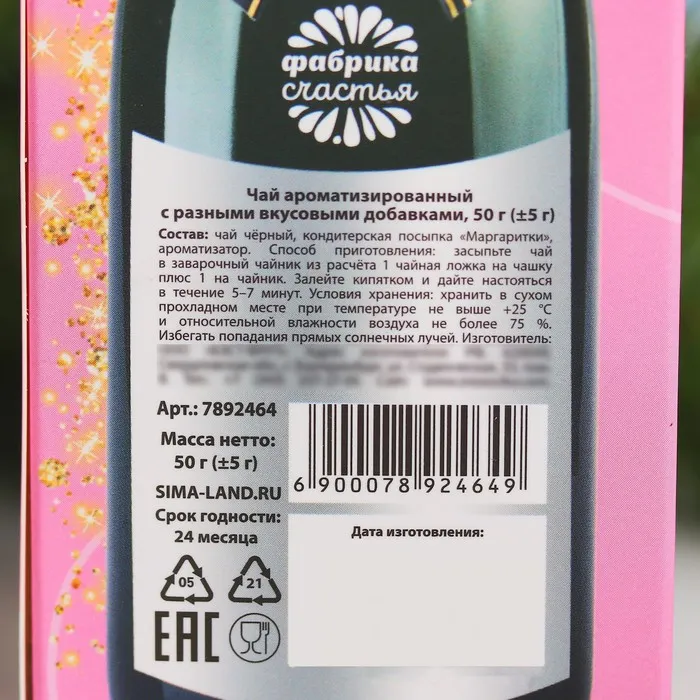 Состав: чай чёрный, кондитерская посыпка «Маргаритки», ароматизатор.