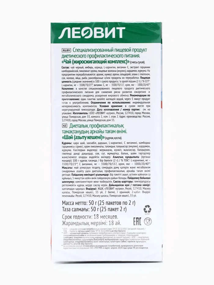 Назначение: в качестве специализированного пищевого продукта диетического профилактического питания для снижения риска развития ожирения и метаболического синдрома, ускорения жирового обмена.