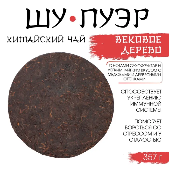 “Шу Пуэр Вековое дерево” способствует укреплению иммунной системы, улучшению пищеварения, снижению уровня “плохого” холестерина, а также помогает бороться со стрессом и усталостью.