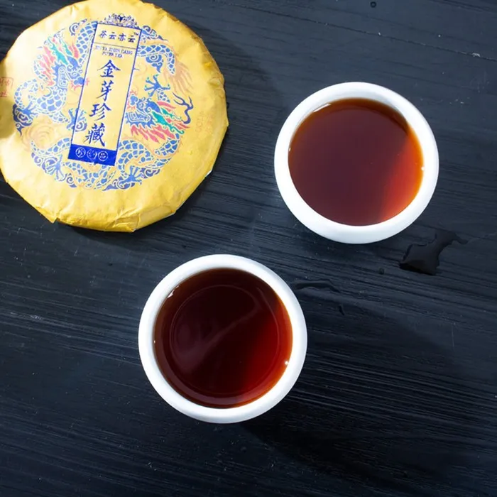Настоящий китайский прессованный Шу Пуэр «Цзинь Я Чжень Цан» Золотая почка. Сырьё собрано со старых деревьев возрастом более 100 лет. Блинчик сдобрен крупными золотистыми чайными почками.
