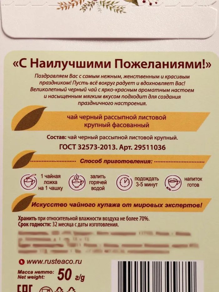 Чай на 8 марта, черный, «С Наилучшими пожеланиями» 50 г — Характеристики