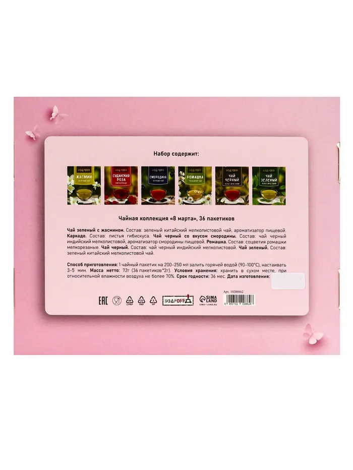 Чайная коллекция "8 марта" — это изысканный набор, созданный специально для празднования Международного женского дня. В упаковке содержится 36 пакетиков качественного чая, который подарит вам и вашим близким уникальные моменты наслаждения и уюта.