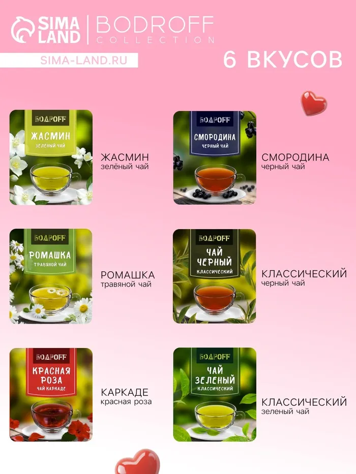 Эта коллекция включает в себя разнообразные сорта чая: от классического черного и зеленого до каркаде и травяного. Каждый пакетик наполнен качественными чайными листьями и натуральными добавками, создающими гармоничные и яркие вкусовые сочетания, которые порадуют даже ценителей.