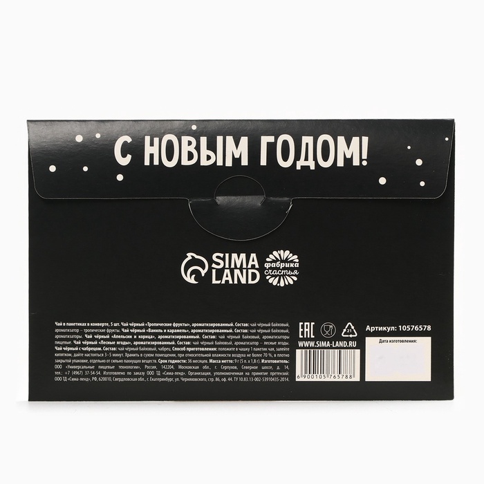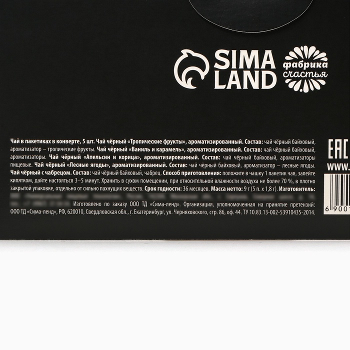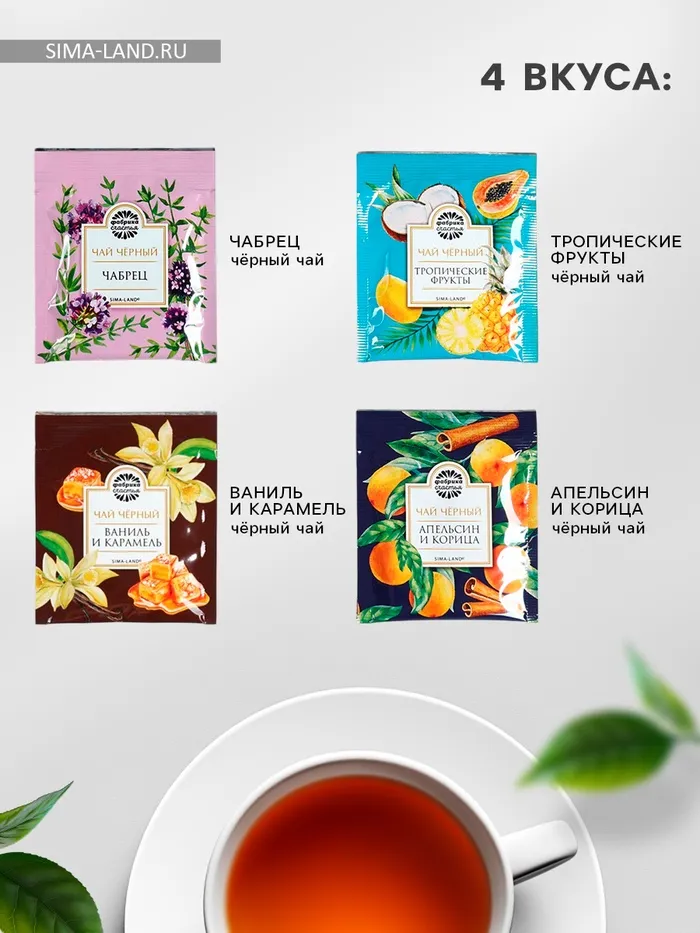 Чай чёрный "Тропические фрукты", ароматизированный. Состав: чай чёрный байховый, ароматизатор тропические фрукты. Чай чёрный "Ваниль и карамель", ароматизированный. Состав: чай чёрный байховый, ароматизаторы. Чай чёрный "Апельсин и корица", ароматизированный. Состав: чай чёрный байховый, ароматизаторы пищевые. Чай чёрный "Лесные ягоды", ароматизированный. Состав: чай чёрный байховый, ароматизатор - лесные ягоды. Чай чёрный с чабрецом. Состав: чай чёрный байховый, чабрец.