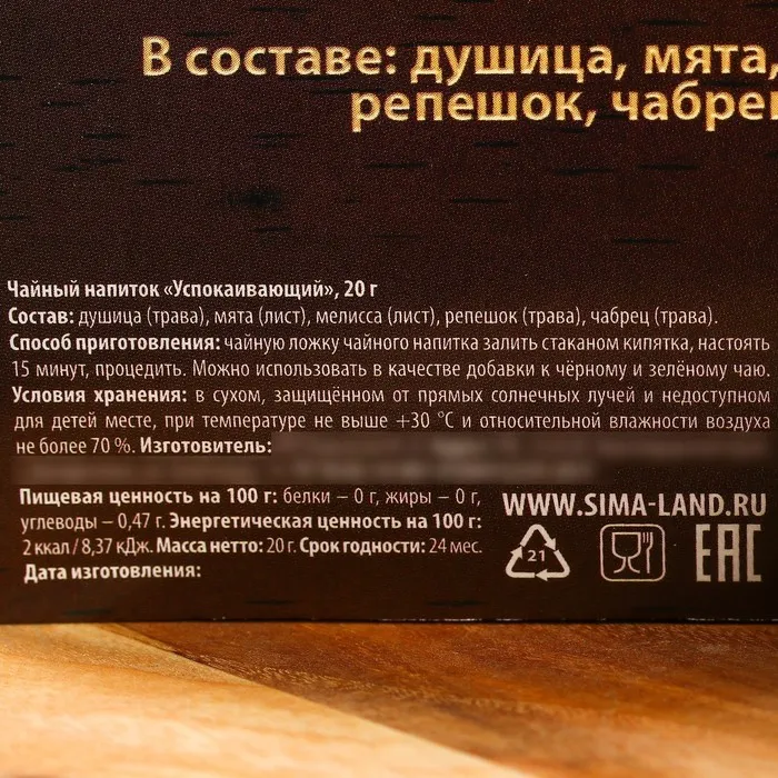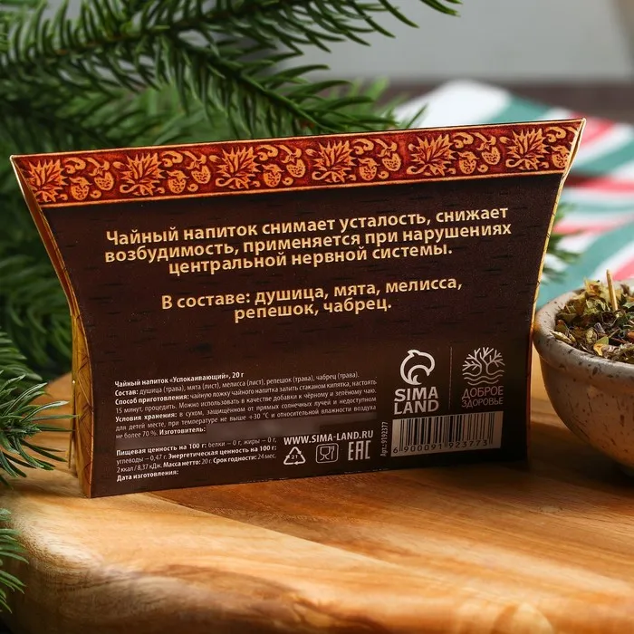 Состав: душица (трава), мята (лист), мелисса (лист), репешок (трава), чабрец (трава).