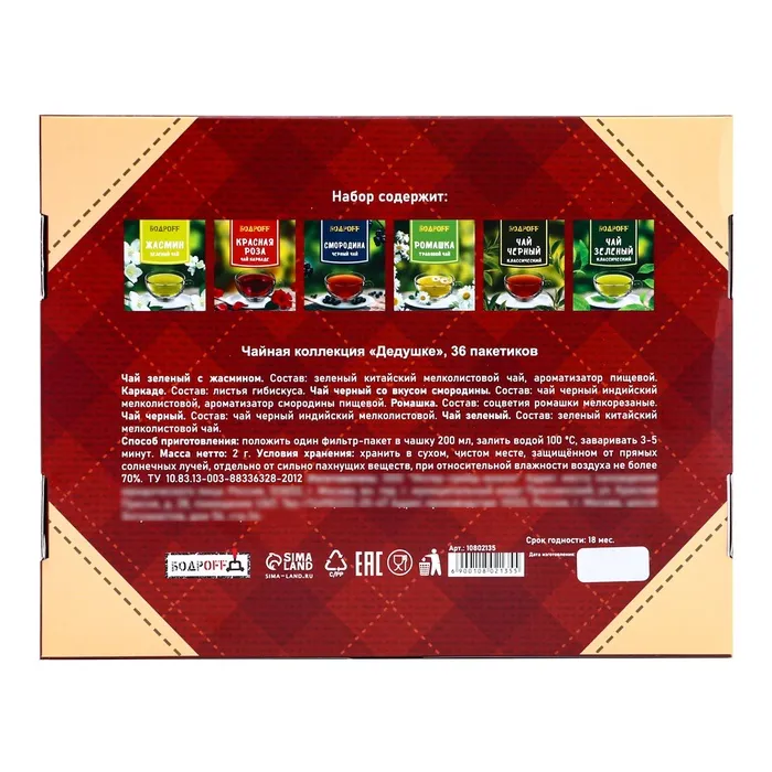 Чайная коллекция "Дедушке" — это теплый и заботливый подарок, созданный специально для тех, кто ценит моменты уюта и общения. В каждой упаковке находится 36 пакетиков с разнообразными сортами чая, тщательно подобранными для того, чтобы подарить радость и расслабление каждому, кто ценит атмосферу семейного чаепития.