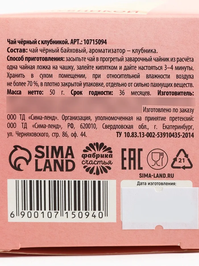 Состав: чай чёрный байховый, ароматизатор – клубника.