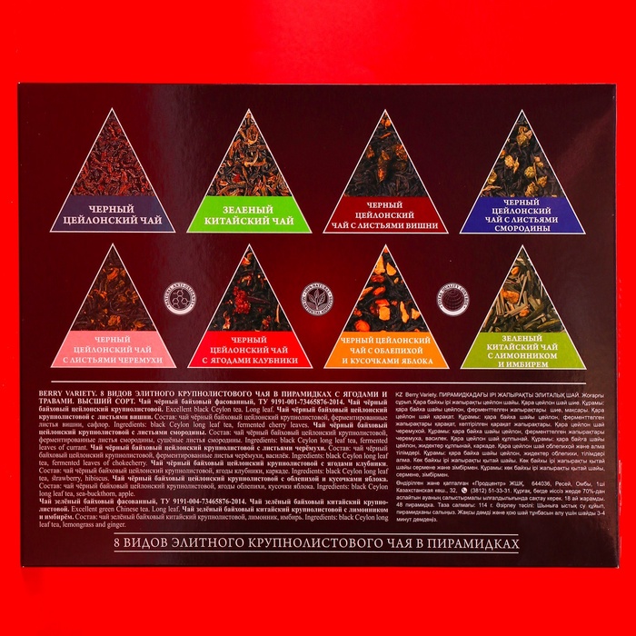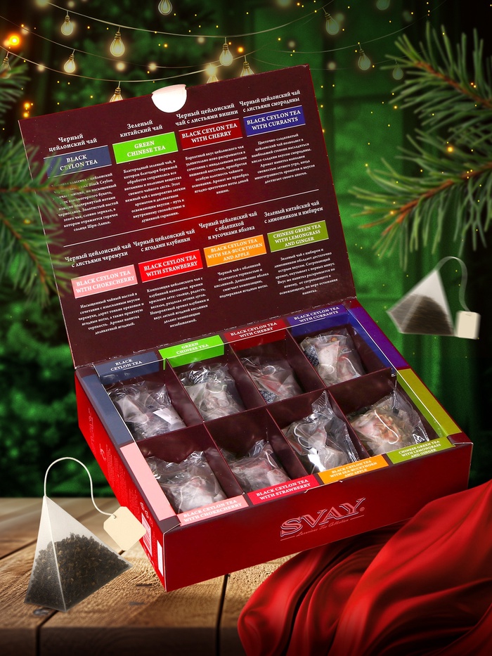 Подарочная упаковка из 48 пирамидок станет отличным презентом для ваших друзей и близких в новогодние праздники. Стильный дизайн подчеркивает оригинальность подарка и делает его идеальным дополнением к новогоднему столу. Чай Svay "Berry Variety" добавит изюминку в ваши праздники и создаст незабываемые моменты общения с близкими.