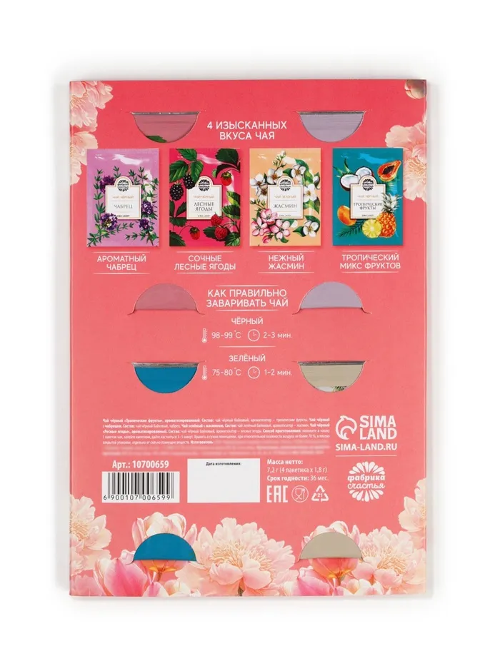 Способ приготовления: положите в чашку 1 пакетик чая, залейте кипятком, дайте настояться 3–5 минут.