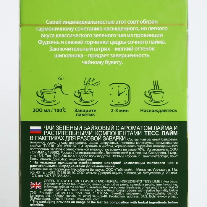 Острая цитрусовая кислинка хорошо оттеняет характерный, немного терпкий вкус зеленого чая. Завершает букет насыщенный, чуть горьковатый аромат лимонной цедры. Зеленый чай Тесс Лайм - удивительное сочетание свежести и терпкости. Лепестки календулы добавляют в напиток нотки пряности и пикантную горчинку. Лимон и лайм придают ему приятный цитрусовый вкус. Насыщенный цвет классического зеленого чая усиливается яркими оттенками фруктово-травяных добавок. Аромат плодов шиповника с легкой кислинкой завершает гармоничный образ чайного букета, который понравится любителям необычных вкусовых ощущений.
