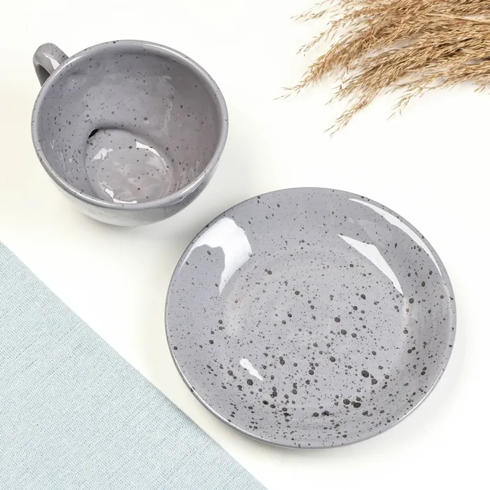 Позвольте себе насладиться моментами спокойствия и уюта с чайной парой «Туман»! Эта изысканная пара, состоящая из чашки и блюдца, станет вашим верным спутником в моменты отдыха и наслаждения любимым напитком. Благородный серый цвет с лёгким краплением и гладкой глазурованной поверхностью привнесут нотки современной элегантности и утонченности.