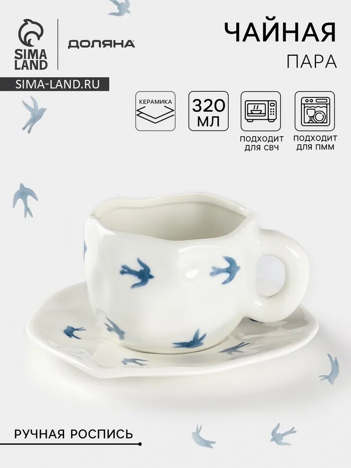 Чайная пара Доляна «Ласточки», чашка 320 мл, блюдце d=16 см, ручная роспись, керамика, белая — Характеристики