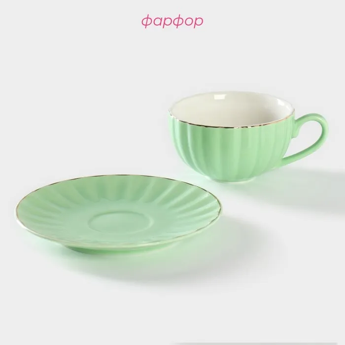 Чайная пара Доляна «Вивьен», 2 предмета: чашка 200 мл, блюдце d=15 см, фарфор, зелёная — Характеристики