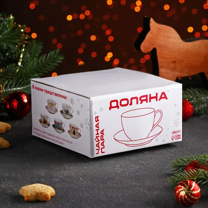 Чайная пара изготовлена из прочного фарфора и украшена красивым новогодним рисунком. Подойдет для чая, кофе и других напитков. Несмотря на свой праздничный внешний вид, чашка и блюдце рассчитаны на ежедневное использование.
