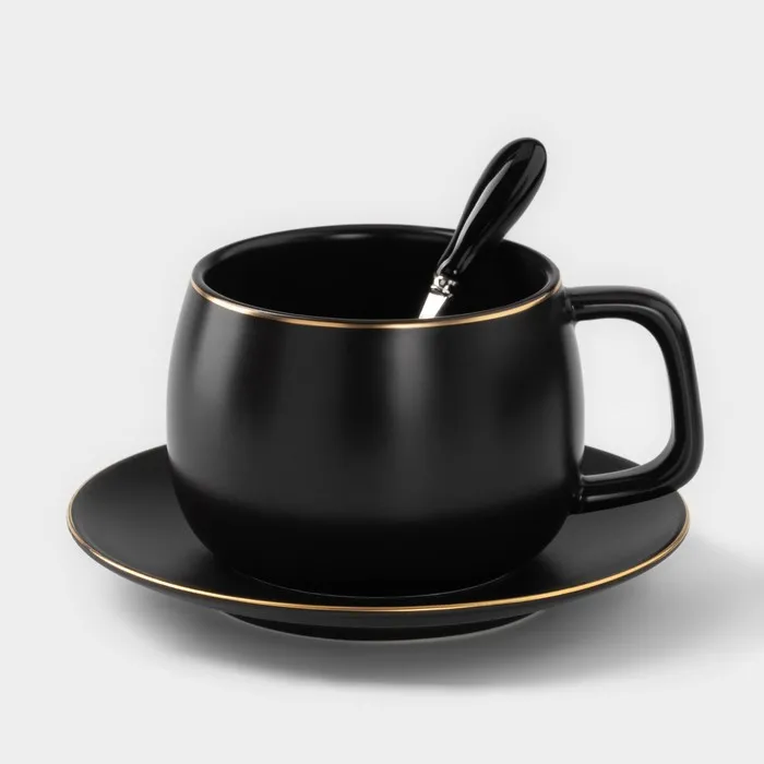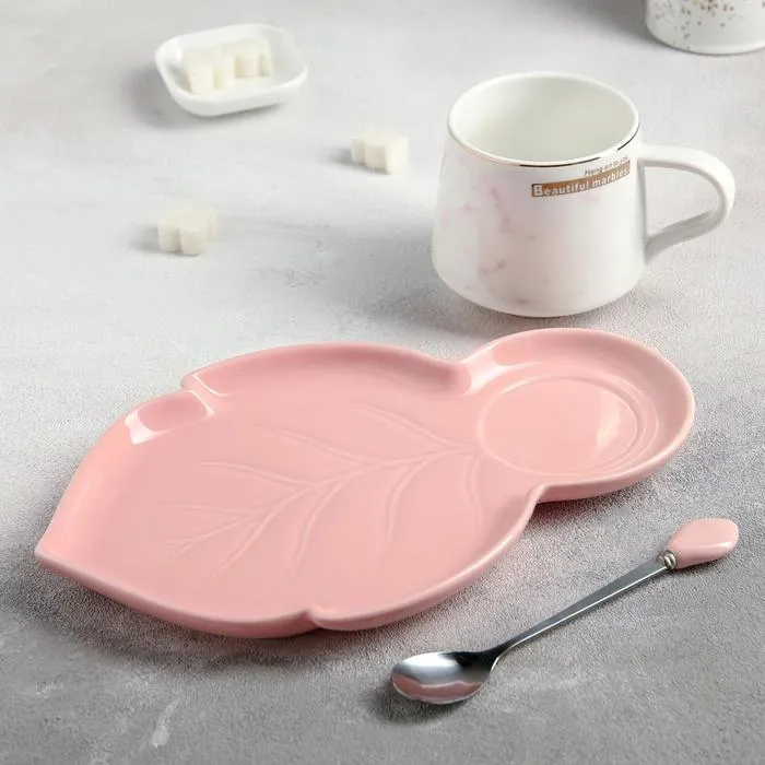 Чайная пара керамическая «Листочек», 3 предмета: чашка 320 мл, блюдце 25,5×16 см, ложка, цвет розовый — Характеристики