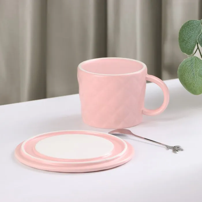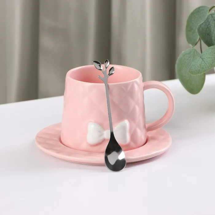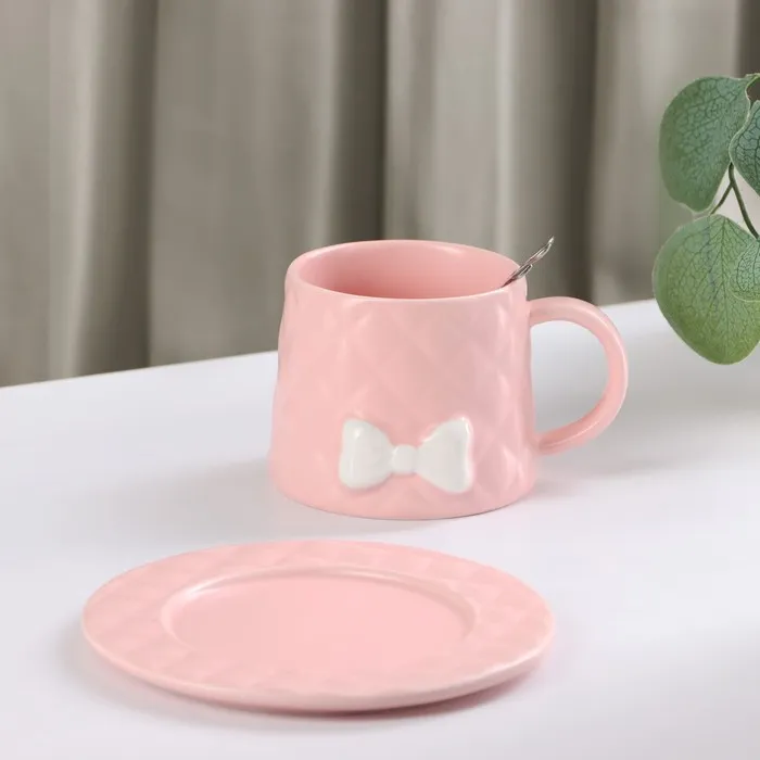 Чайная пара керамическая с ложкой «Бантик», 2 предмета: кружка 350 мл, блюдце d=15 см, цвет розовый — Характеристики