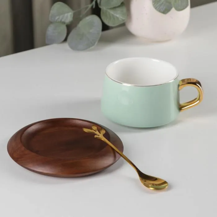 Чайная пара керамическая с ложкой «Улун», 2 предмета: чашка 280 мл, блюдце d=13 см, цвет светло-зелёный — Характеристики