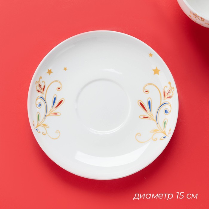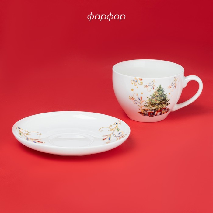 Чайная пара новогодняя Доляна «Волшебное дерево», 2 предмета: чашка 210 мл, блюдце d=15 см, фарфор, белая — Характеристики