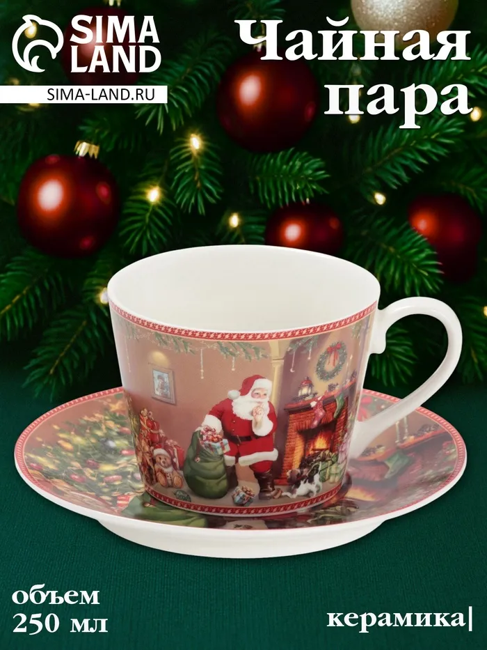 Чайная пара новогодняя «Ночь чудес», 2 предмета: чашка 250 мл, блюдце d=15 см, керамика, подарочная упаковка, разноцветная — Характеристики