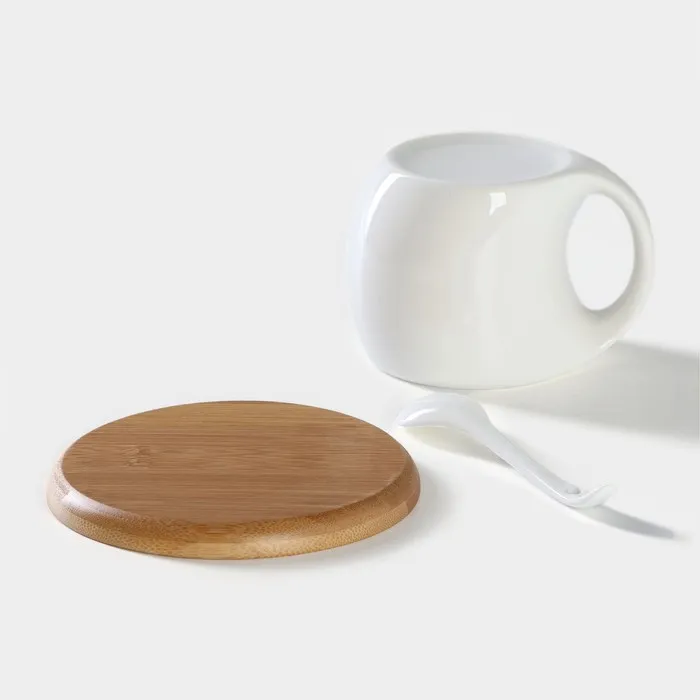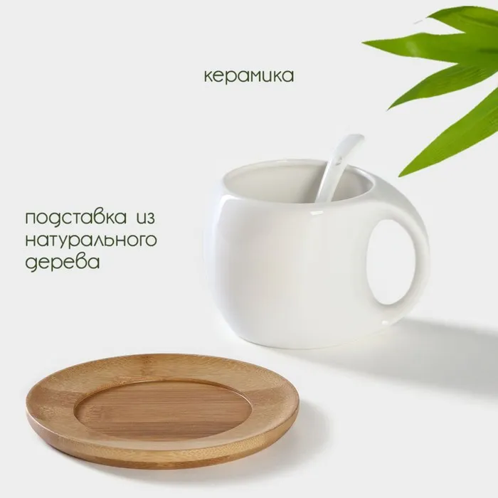 Чайная пара с ложкой BellaTenero, 3 предмета: чашка 220 мл, керамика, ложка, деревянное блюдце, белая — Характеристики