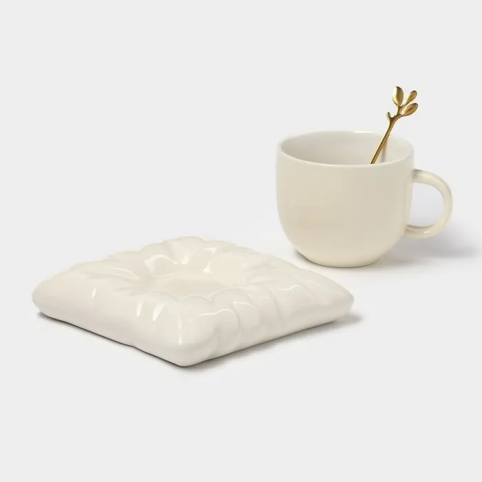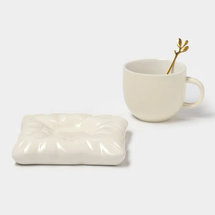 Чайная пара с ложкой «Зефирка», 2 предмета: чашка 250 мл, блюдце d=13 см, керамика, бежевая — Характеристики