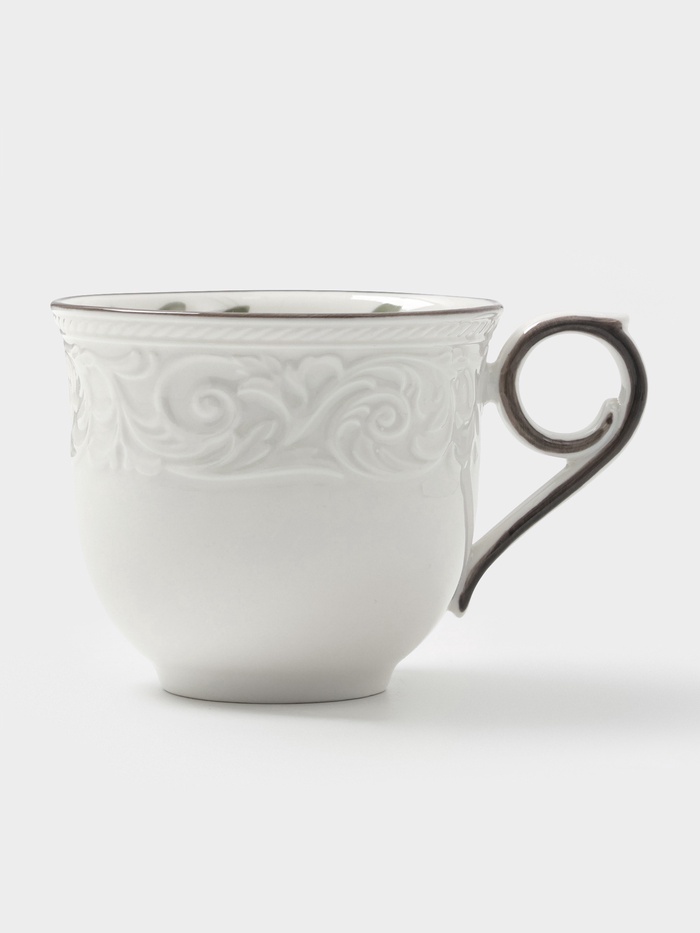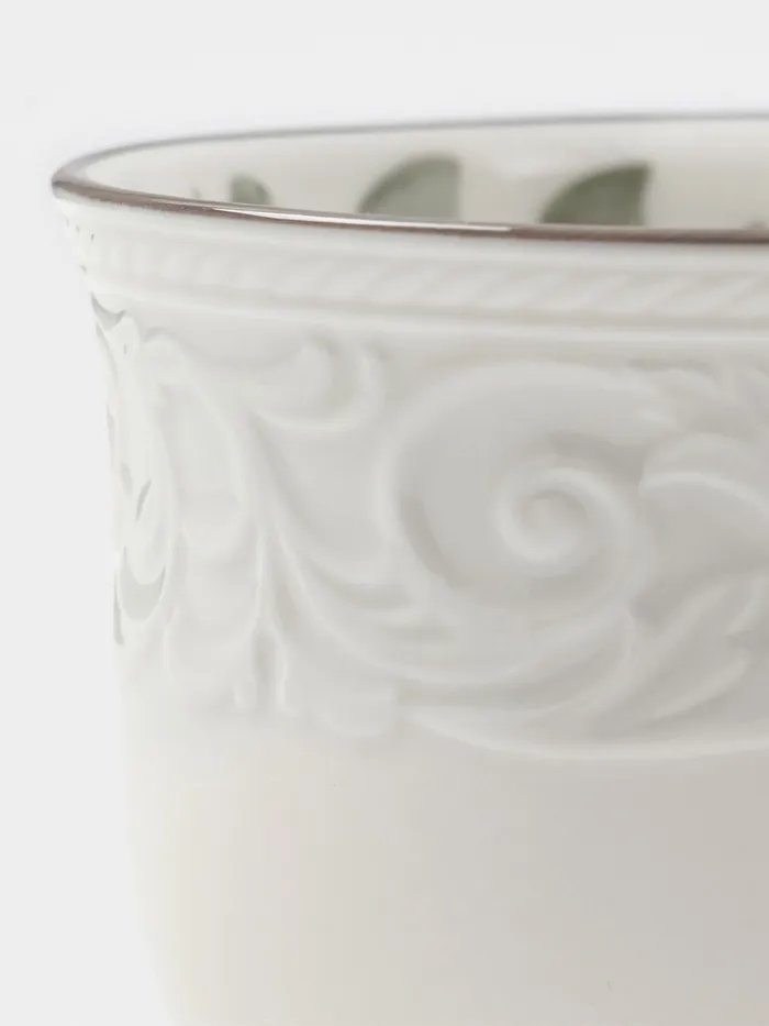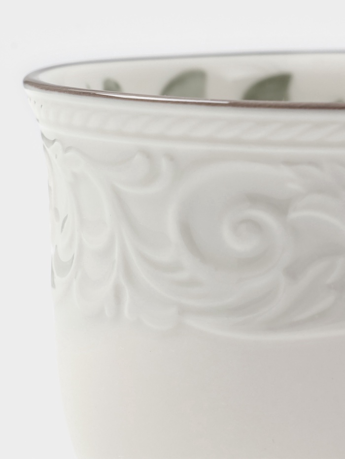 Чашка отличается удобной формой, которая комфортно ложится в руку, а глазурованная поверхность с выдавленным узором подчеркивает изысканность изделия. Использование в микроволновой печи позволяет легко разогревать напитки, а прочная фарфоровая основа обеспечивает долговечность даже при частом использовании.