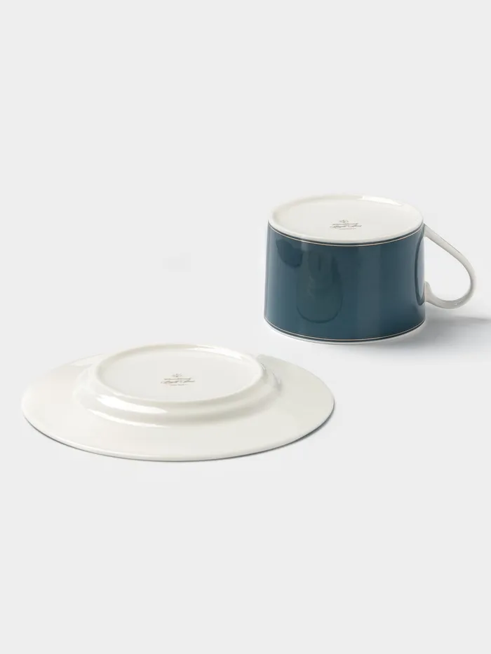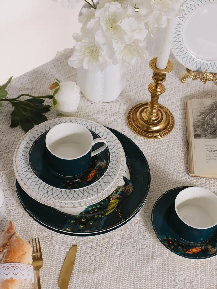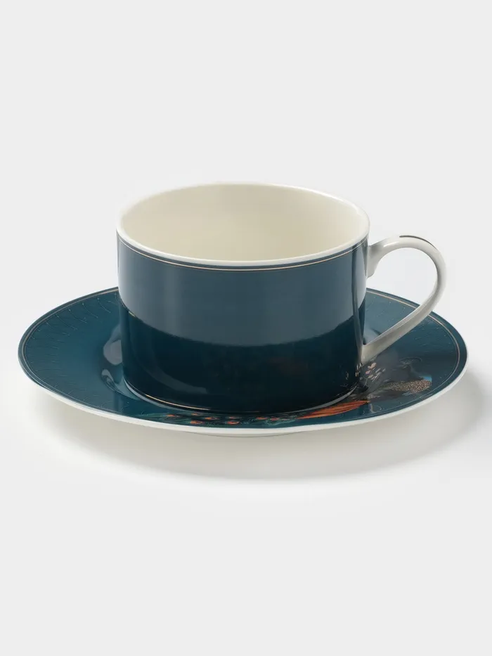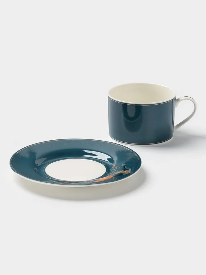 Ощутите легкость и изящество с этой восхитительной бирюзовой чайной парой из тонкого фарфора, украшенной изысканным изображением королевской птицы.