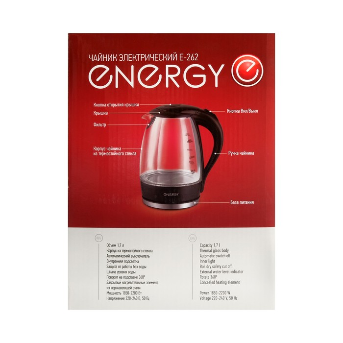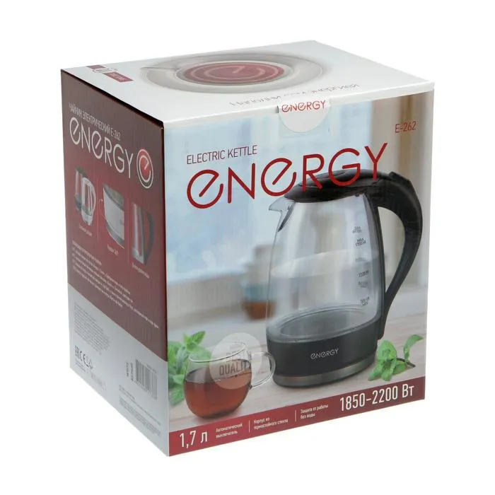 Электрический чайник ENERGY E-262 — это стильное и прочное устройство, созданное для удобства и долговечности. Корпус выполнен из высококачественного термостойкого стекла, которое позволяет наблюдать за процессом кипячения воды. Прочный стеклянный материал не только придаёт чайнику современный вид, но и обеспечивает безопасность при использовании. Мощный нагревательный элемент быстро доводит воду до кипения, а удобная эргономичная ручка делает эксплуатацию максимально комфортной. ENERGY E-262 станет надёжным помощником на вашей кухне.