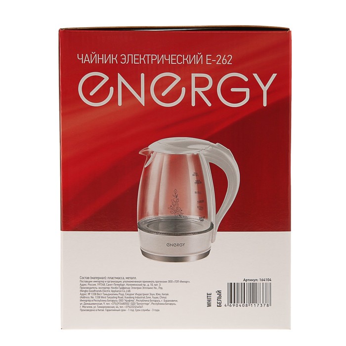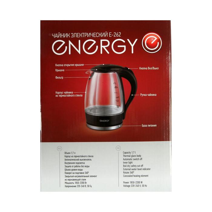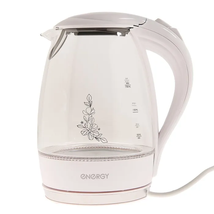 Чайник электрический ENERGY E-262, стекло, 1.7 л, 2200 Вт, белый — Характеристики