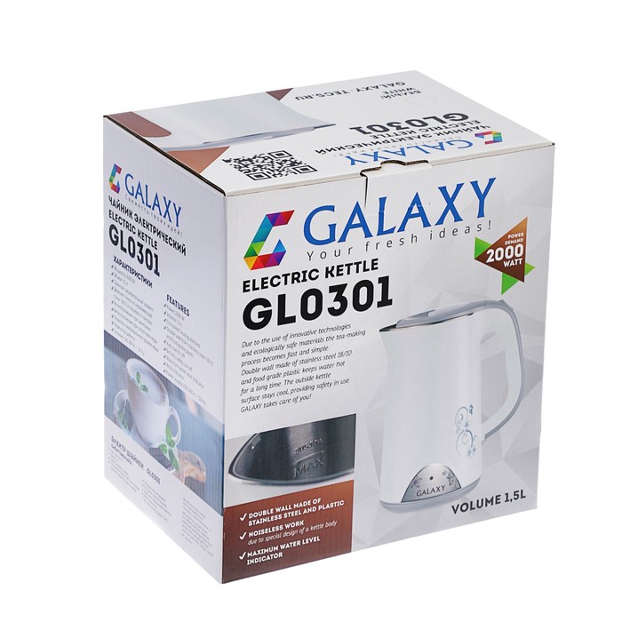 Чайник электрический Galaxy GL 0301, пластик, колба металл, 1.5 л, 2000 Вт, белый — Характеристики