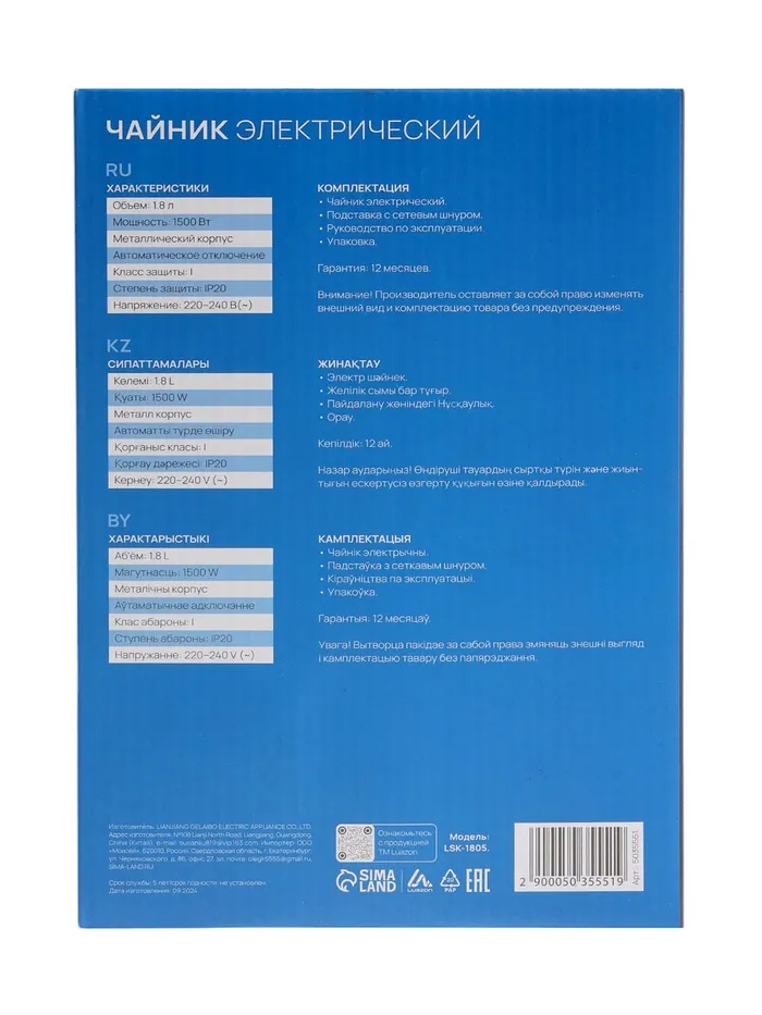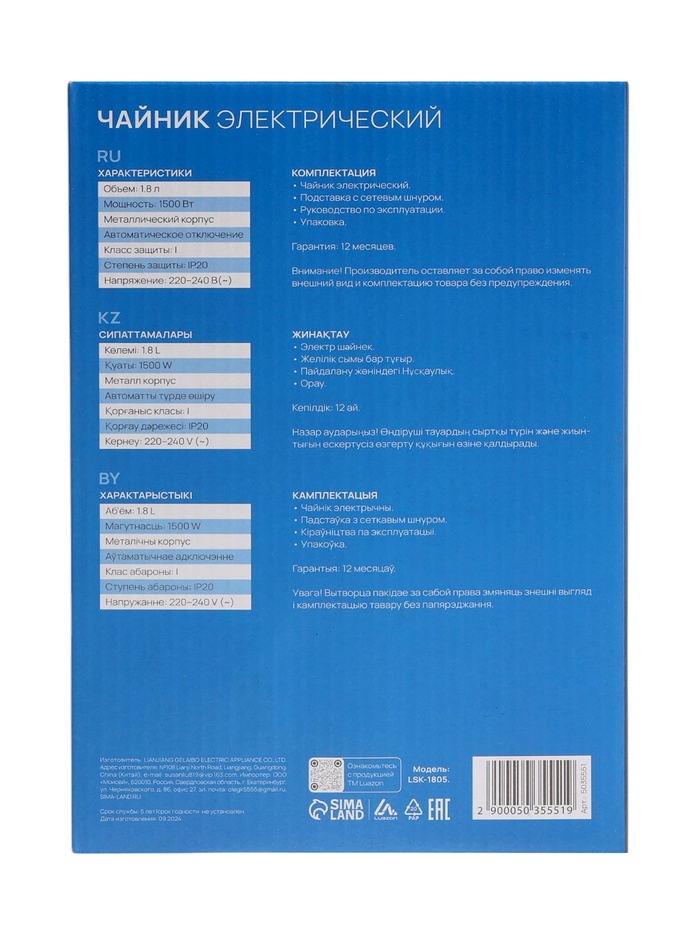 Чайник электрический Luazon LSK-1805, металл, 1.8 л, 1500 Вт, серебристый — Характеристики