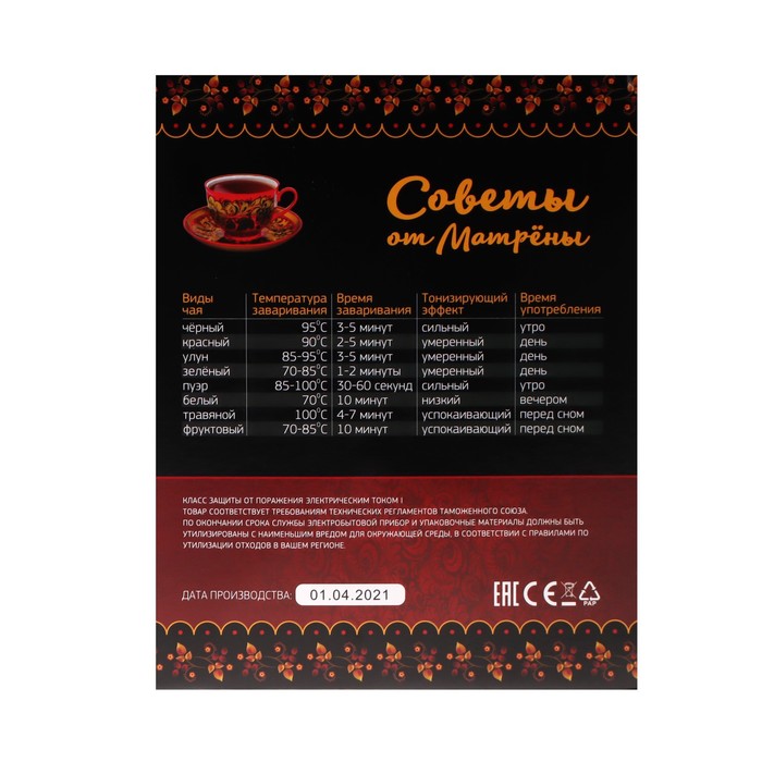 Электрический чайник МАТРЁНА MA-120 — это надёжное и безопасное устройство для кипячения воды. Он оснащён автоматическим выключателем, который отключает чайник сразу после закипания воды, предотвращая перегрев и экономя электроэнергию. Функция защиты от работы без воды обеспечивает дополнительную безопасность, автоматически прекращая работу устройства, если в нём нет жидкости. МАТРЁНА MA-120 сочетает в себе простоту использования, безопасность и практичный дизайн, что делает его отличным выбором для вашей кухни.
