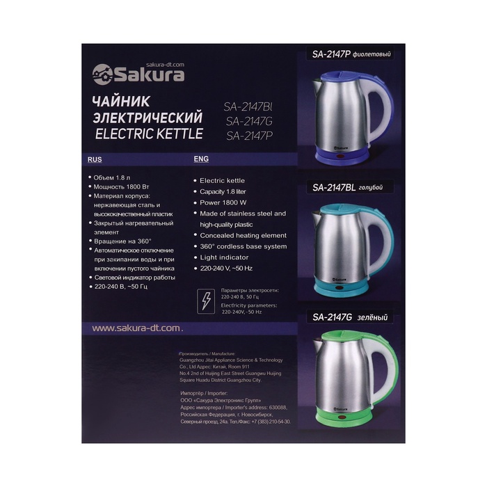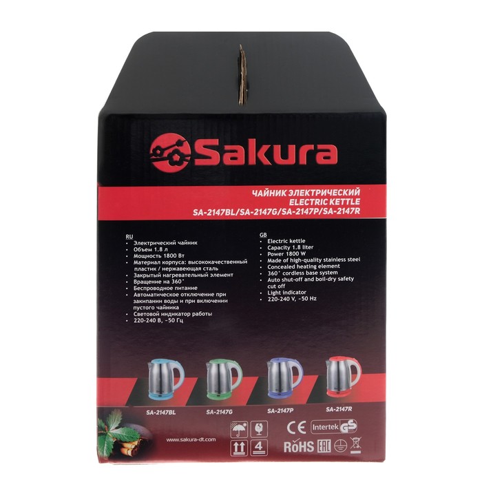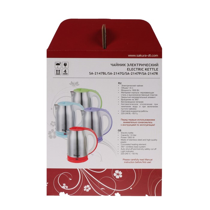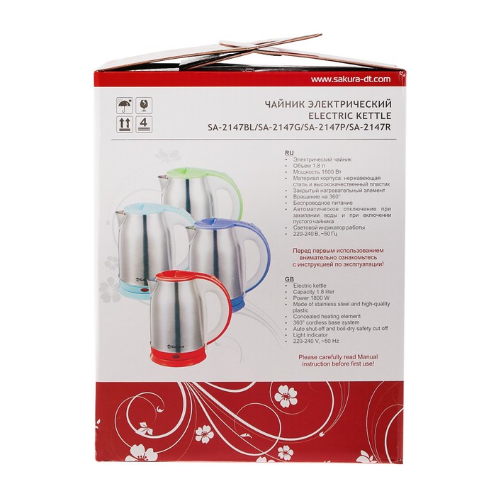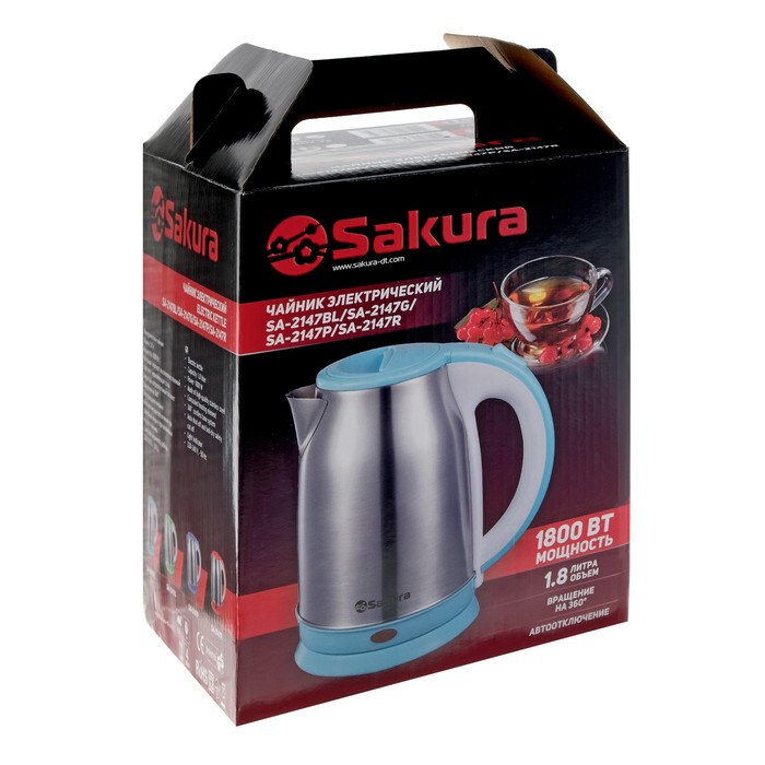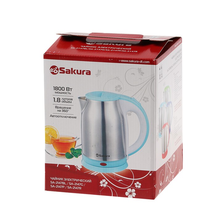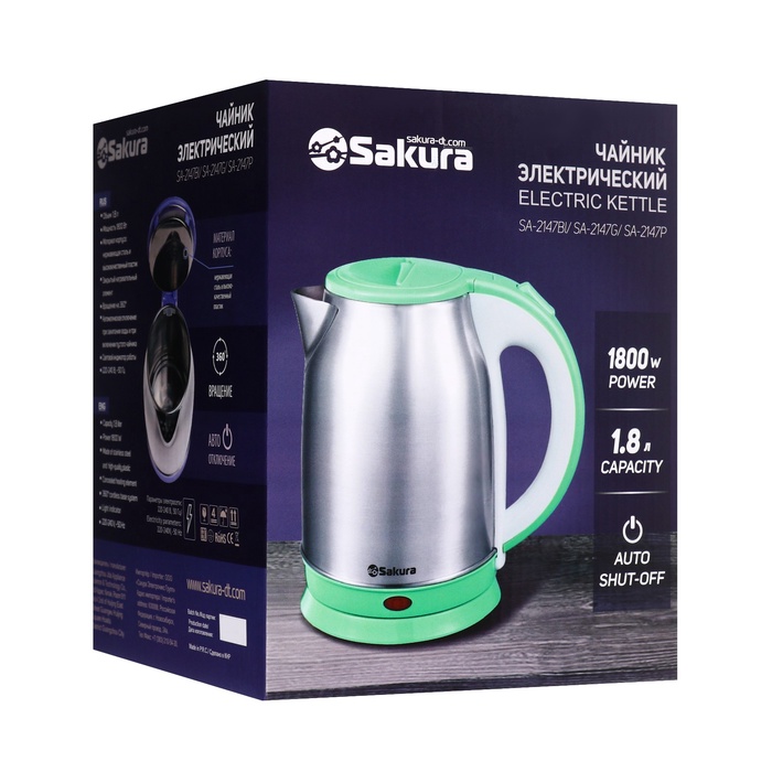 Чайник электрический Sakura SA-2147G, металл, 1.8 л, 1800 Вт, зеленый — Характеристики