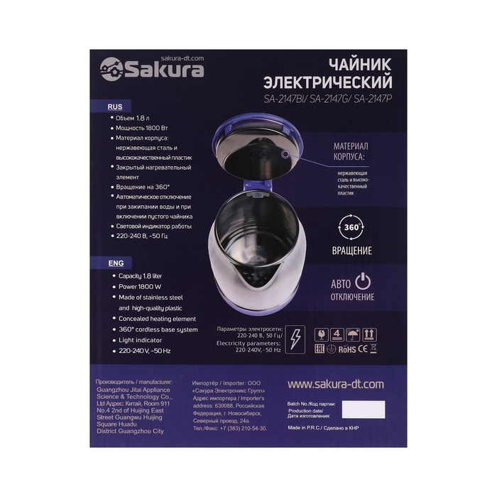 Электрический чайник Sakura SA-2147BL — это надёжное устройство с прочным корпусом из металла, обеспечивающим долговечность и стильный внешний вид. Оснащён световым индикатором работы, который позволяет удобно отслеживать процесс нагрева воды. Функция вращения на 360 градусов делает использование чайника максимально удобным, независимо от того, с какой стороны вы его берёте. Sakura SA-2147BL сочетает современный дизайн, удобство и высокую функциональность, идеально подходя для ежедневного использования.