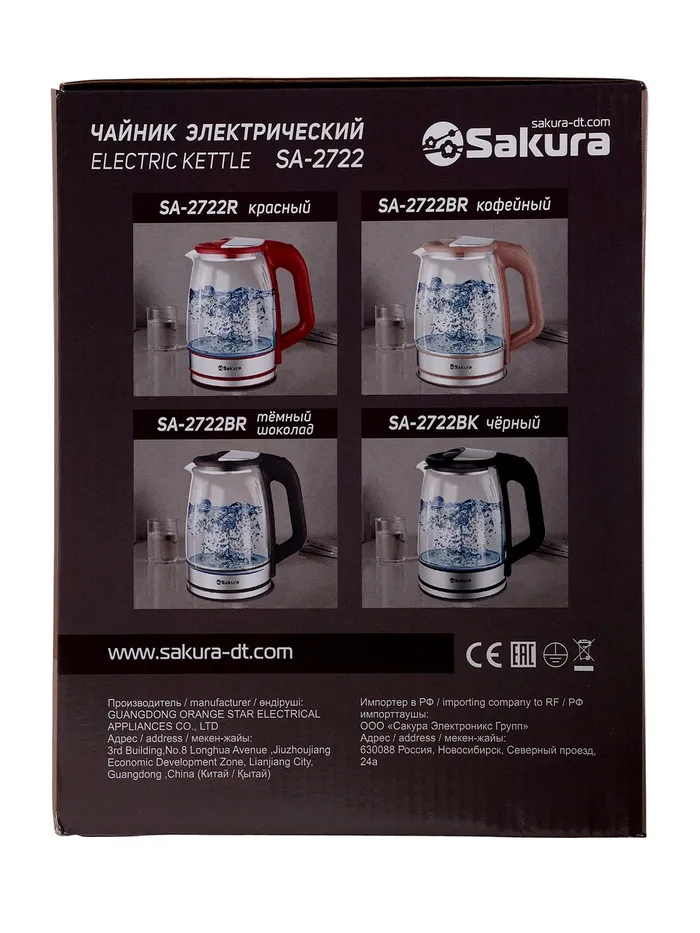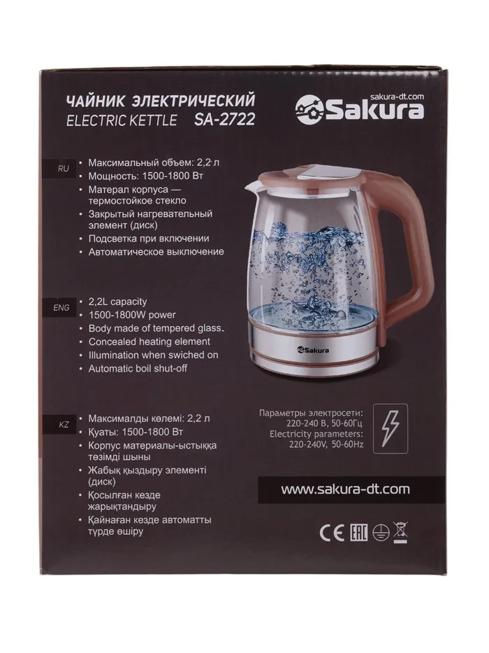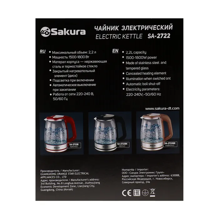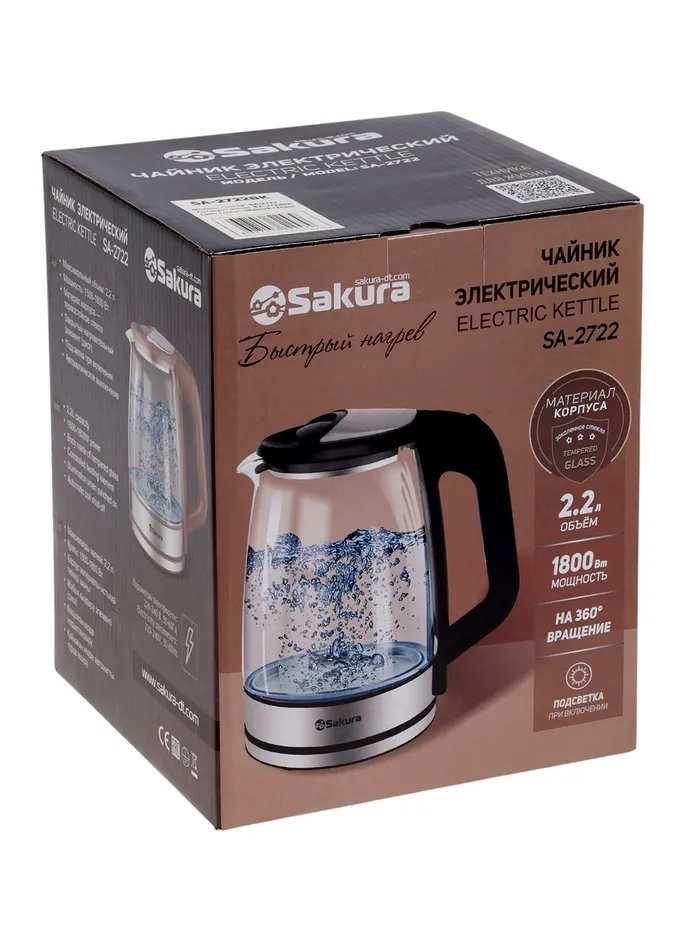 Чайник электрический Sakura SA-2722BK, стекло, 2.2 л, 1800 Вт, подсветка, серебристо-чёрный — Характеристики