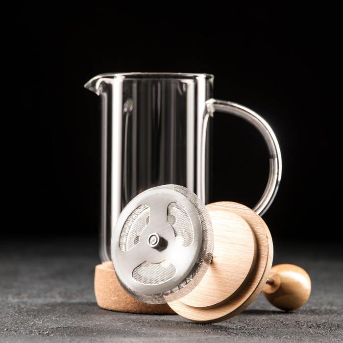 Стеклянный френч-пресс хорошо держит тепло, раскрывает вкус любимых напитков. Стальной поршень не вступает в реакцию с жидкостью, не наделяет ее металлическим привкусом.Принцип работы френч-пресса прост: